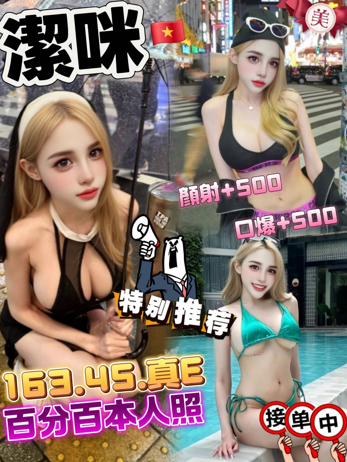 中文溝通、無套吹、鴛鴦戲水、親親、品鮑、69、 按摩、奶炮、奶推、屁推、舔蛋、穿絲襪(需自備)、角色扮演(需自備)