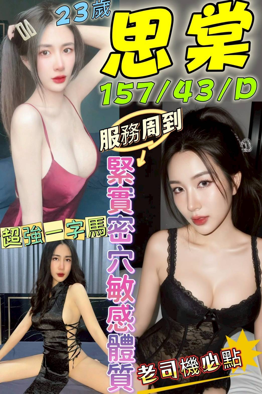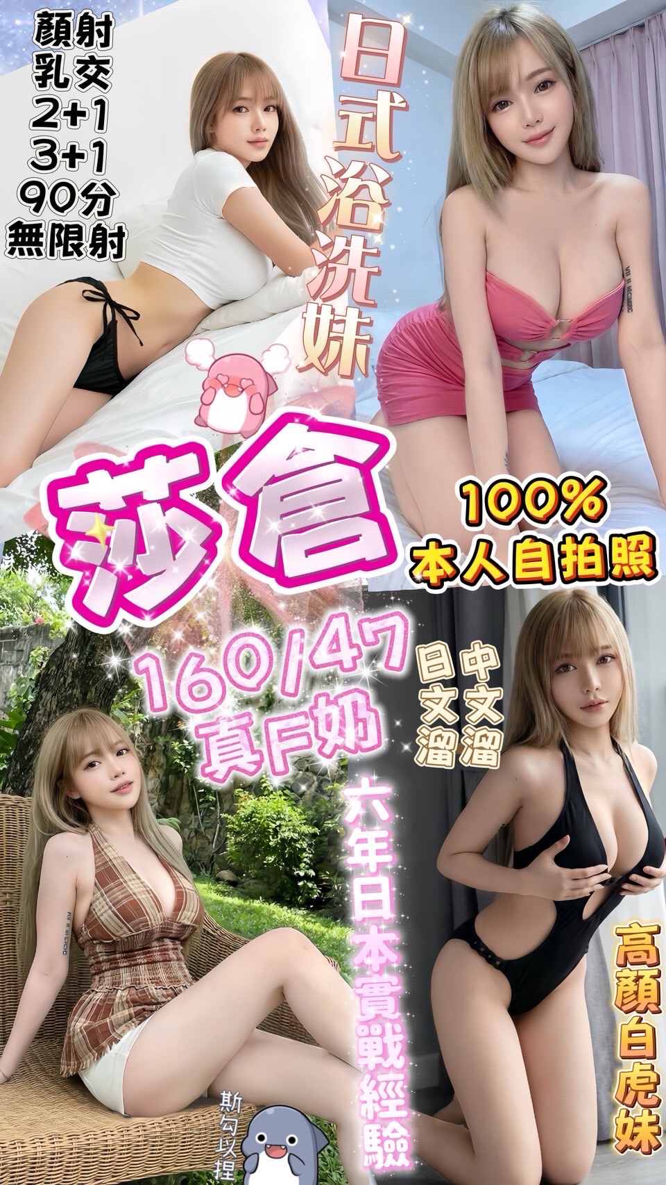 中文溝通、無套吹、鴛鴦戲水、舌吻、親親、品鮑、69、 按摩、奶炮、奶推、屁推、舔蛋、穿絲襪(需自備)、角色扮演(需自備)